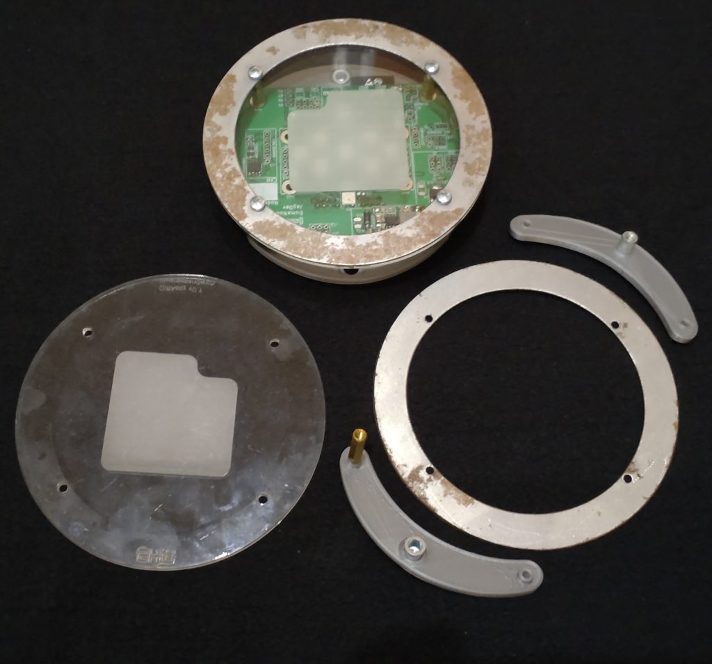 I created 3D printed fixing brackets with steel threaded inserts that fix the PCB to the dome. Using laser cut acrylic I designed a clear cover to protect the PCB and by etching the acrylic to create a LED diffuser as a single piece.