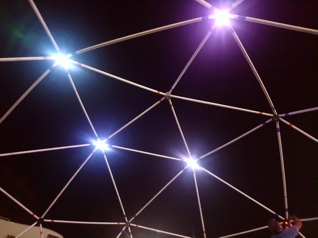 Surrey & Hampshire Makerspace’s Geodesic dome. This is the first assembly of the complete networked lighting system within the structure.